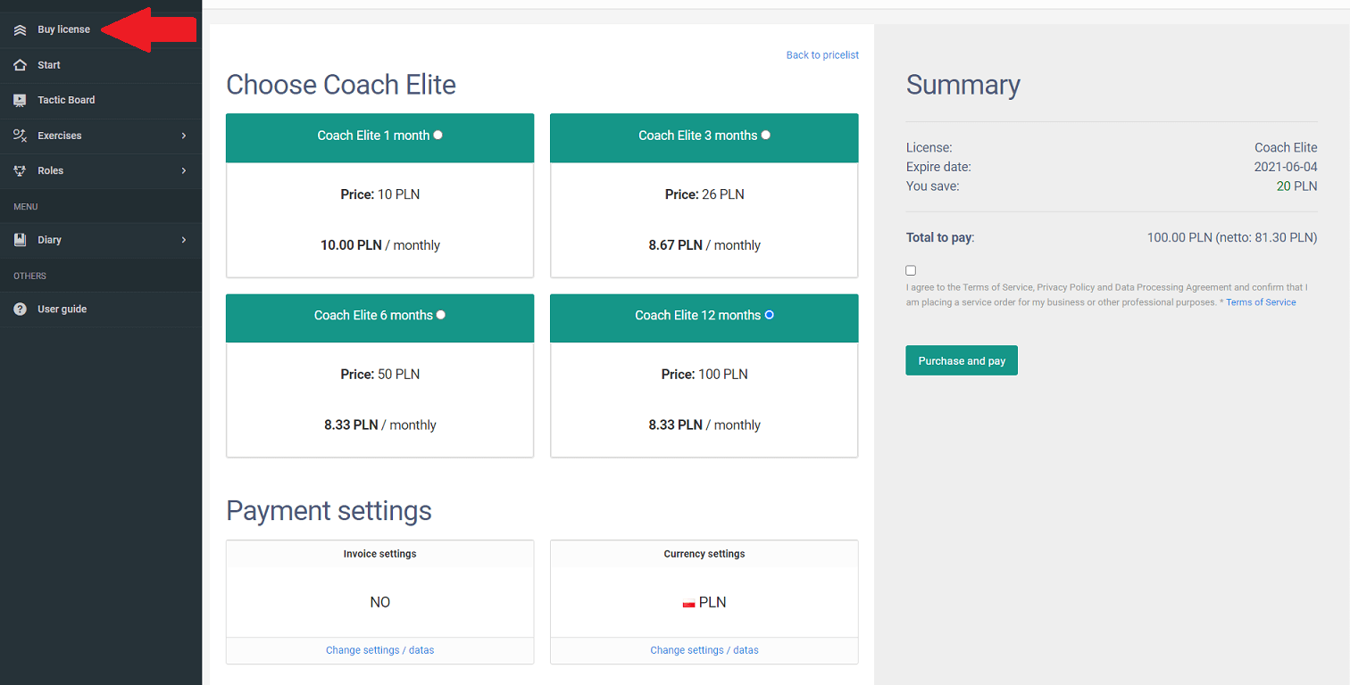 Pirms licences iegādes jūs varat izmantot mūsu bezmaksas trenera kontu. Vairāk par licenci varat uzzināt cenrādī. Ja jūs nolemjat iegādāties individuālo licenci, jums jābūt aktīvam trenera kontam. Pēc pieteikšanās sistēmā izvēlieties opciju "pirkt licenci" no kreisās puses izvēlnes. Izvēlieties jūs interesējošo paketi un tās derīguma termiņu. Ja jums nepieciešams rēķins, aizpildiet nepieciešamos datus un pārejiet uz maksājumu. Maksājums tiek veikts caur maksājumu platformu - DotPay. Jūsu licence būs aktīva uzreiz pēc tam, kad mēs būsim saņēmuši jūsu pārskaitījumu.