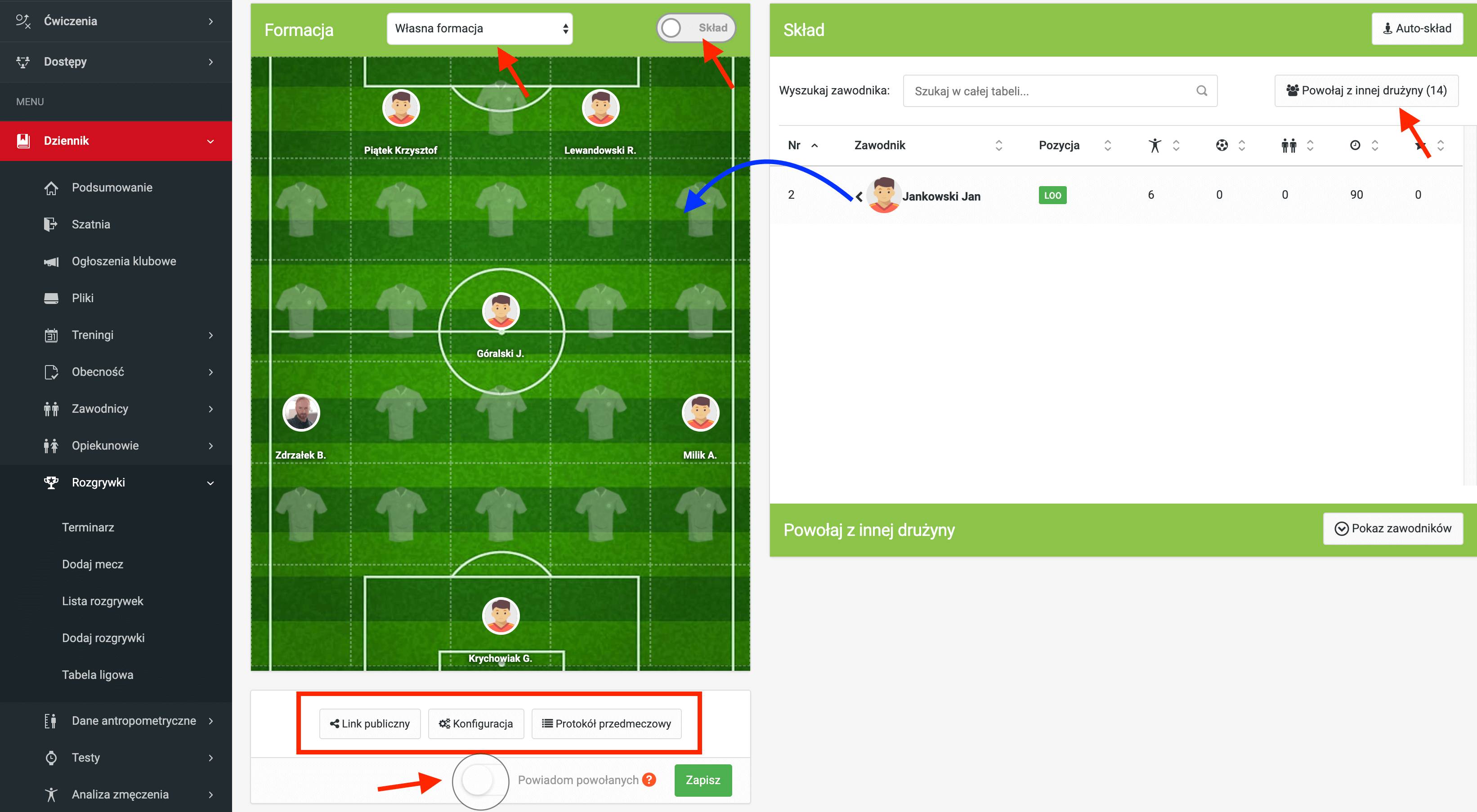 Aby zawodnikom obliczane były statystyki meczowe takie jak np. czas na boisku, musisz powołać ich do składu meczowego. Aby dodać zawodnika na boisko, złap wybranego zawodnika myszką i przeciągnij go z listy zawodników na wybraną pozycję na boisku. Ustalać skład możesz także z poziomu aplikacji mobilnej.