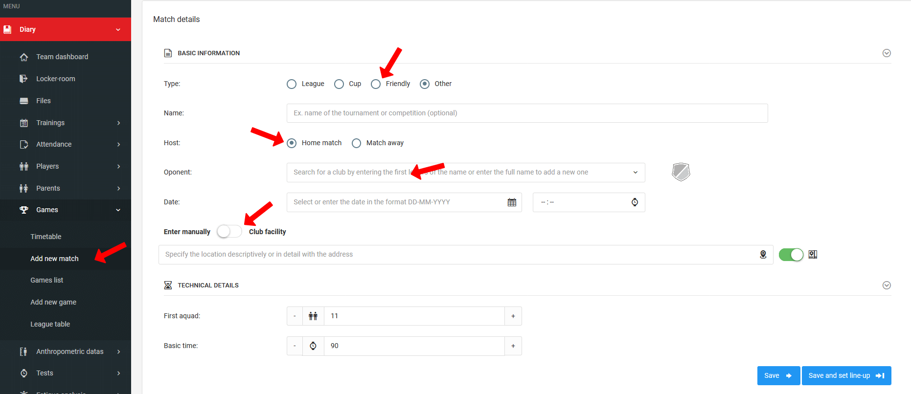 Para adicionar uma única partida à sua programação, clique no menu à esquerda diário jogos adicionar nova partida. Após clicar neste link, você será redirecionado para a janela de criação da partida. Preencha alguns campos que aparecerão no formulário. Lembre-se de especificar o tipo de partida, oponente, data, hora e local. Quanto à localização, você pode inseri-la manualmente ou usar os objetos predefinidos inseridos a partir da conta de administrador. Depois de preencher todos os campos, salve o formulário e prossiga para completar a escalação da partida.