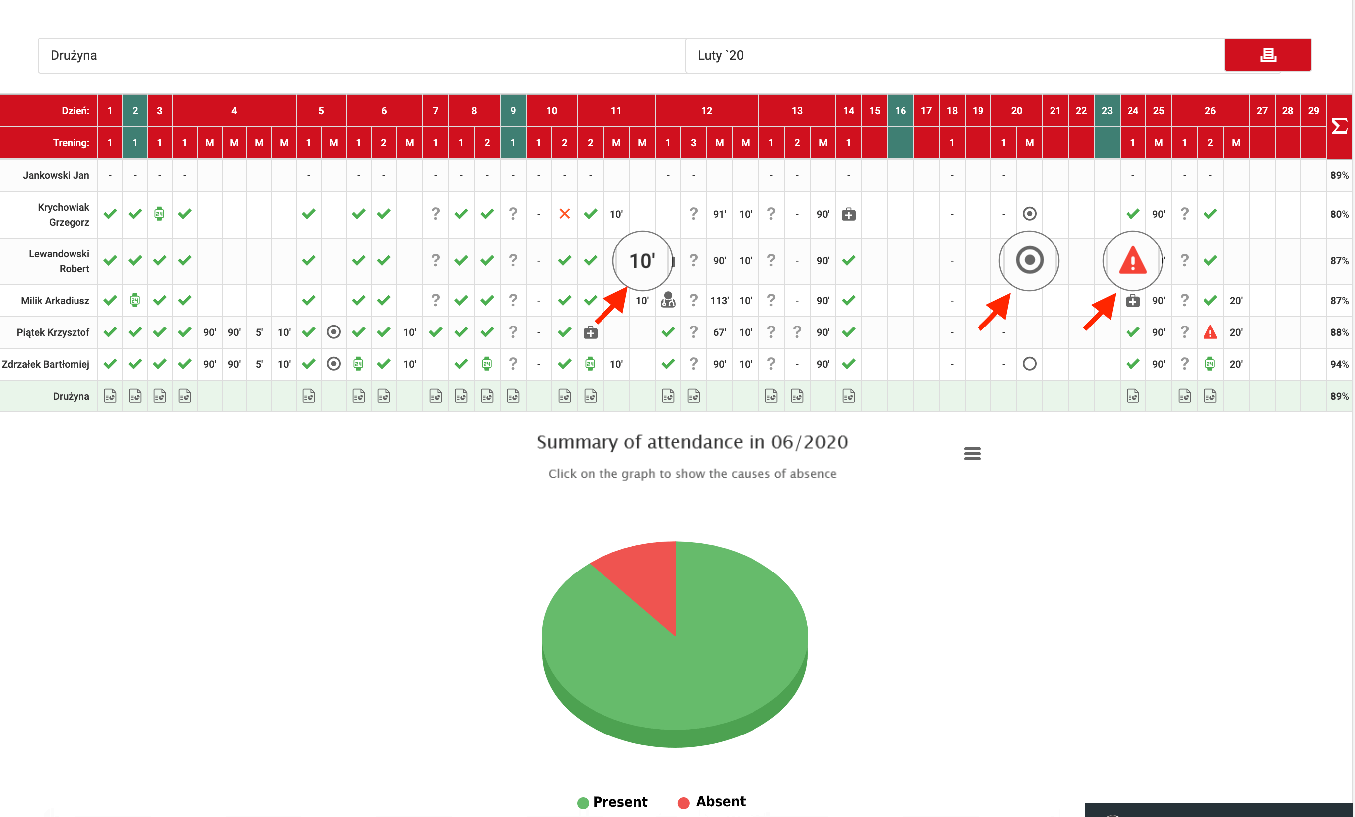 В таблице приведены данные тренировок и матчей. Иконки символизируют присутствие игрока во время тренировки или причину его отсутствия. Символы совпадения (пустой круг или полный круг) означают первую команду или скамью. Если вы заполните статистику матча, время игрока появится в таблице. В верхней части страницы есть флажки, которые позволяют изменять отображаемые месяцы, а также сужать статистику, представленную в таблице, для одного выбранного игрока. Последний столбец и последний ряд таблицы содержат сводные данные о посещаемости игрока за месяц и команд в данной тренировке.
